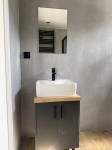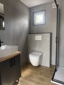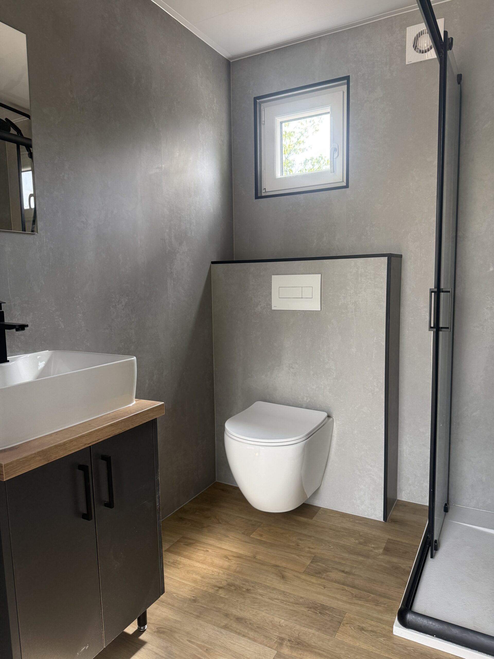 De badkamer is ingericht met een Cersanit Sat 50 wastafel in wit uitgevoerd in keramiek met Fabro chrome kraan. En tevens een spiegel (40 x 60cm) met witte achterplaat. En een Mexen Roma douchebak (120x80cm) in zwart uitgevoerd met Fabro chrome kraan met regendouche. De wandafwerking is standaard betonlook SPC. Het toilet is standaard uitgevoerd als hangtoilet in de kleur wit.