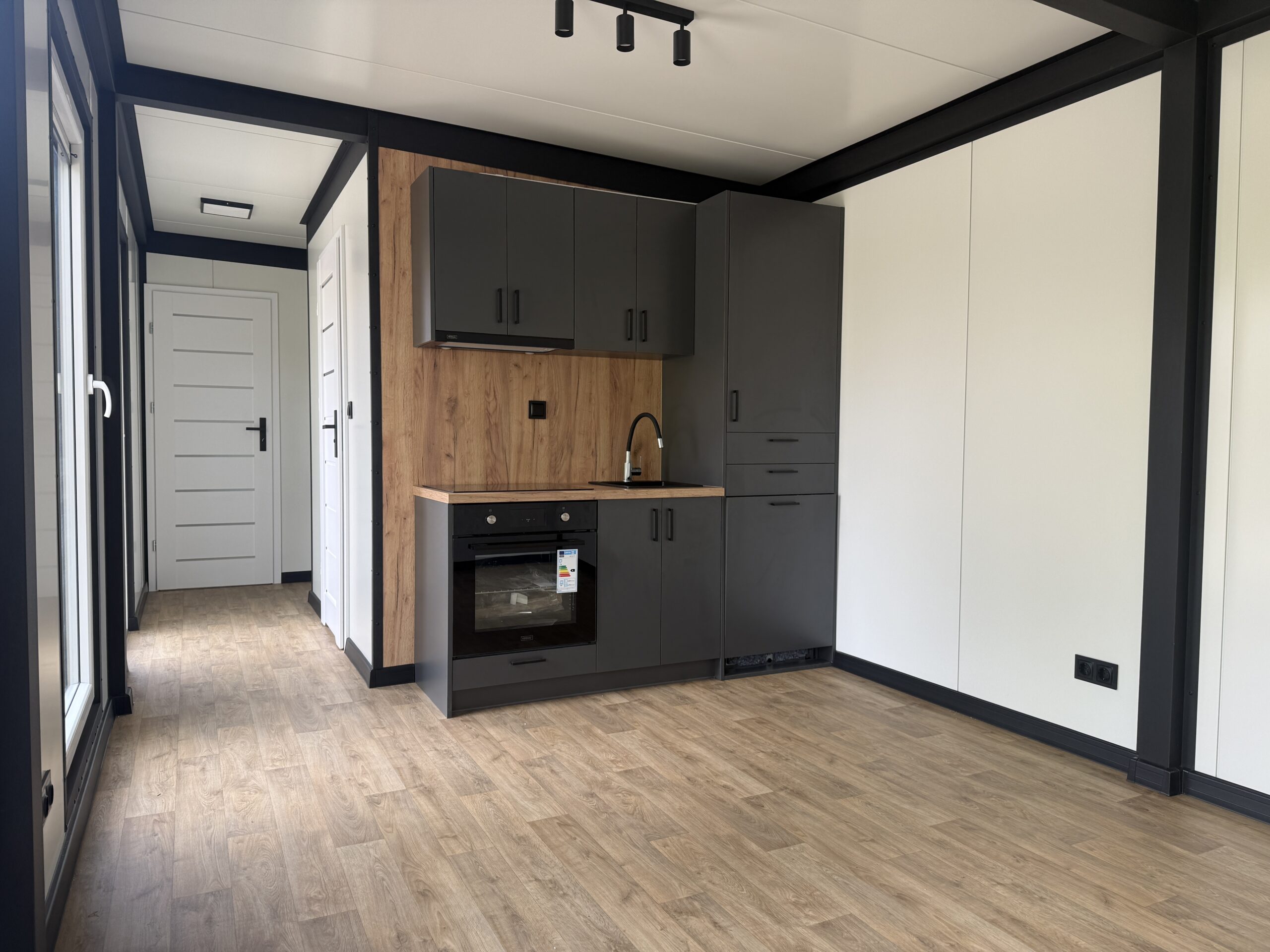 De keuken is van alle gemakken voorzien. In elke keuken wordt standaard in de antraciet met houtlook kleurstelling geleverd.In de keuken bevinden zich standaard een indictiekookplaat met 2 pitten. Een oven met als optie magnatronfunctie. Boven de kookplaat een in het zwart afgewerkte afzuigkap met de uitblaas naar buiten. Ingebouwde koelkast met optionele vriezer. Standaard is deze keuken zelfs voorzien van een vaatwasser en uiteraard een harstenen wasbak in het zwart uitgevoerd met zwarte flexkraan.