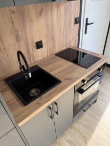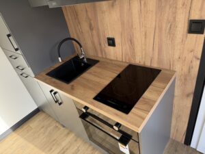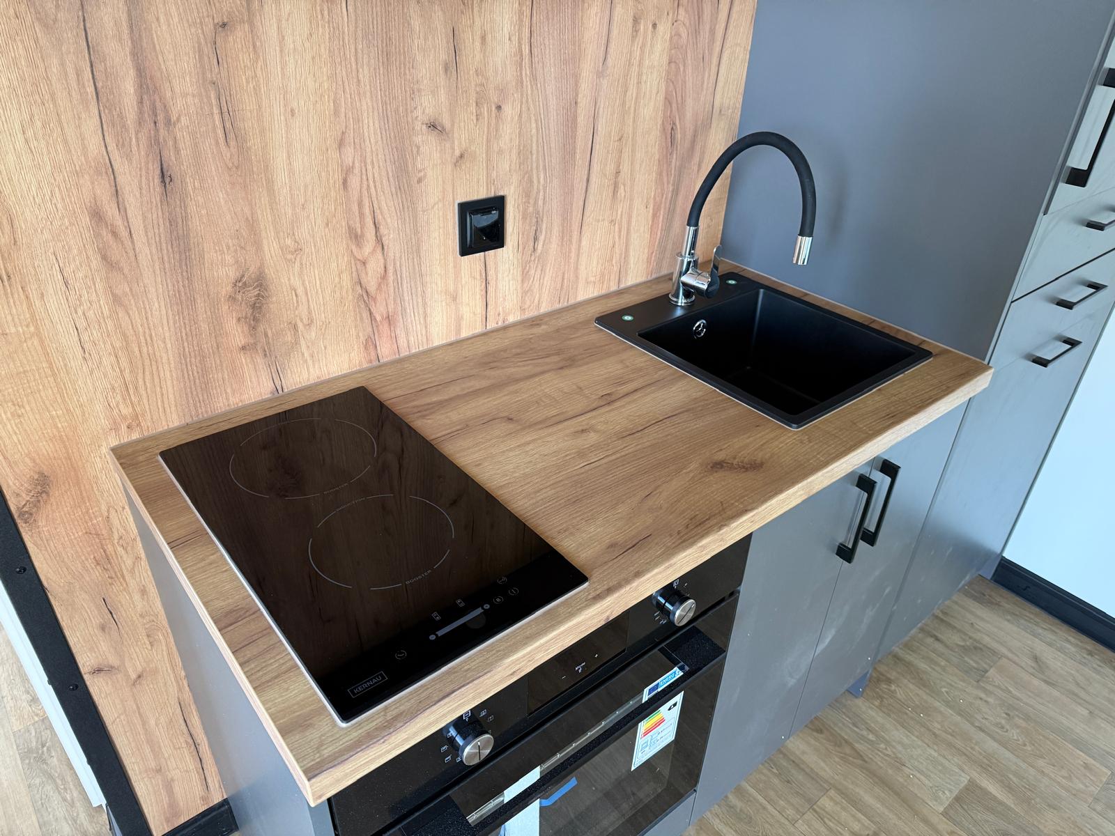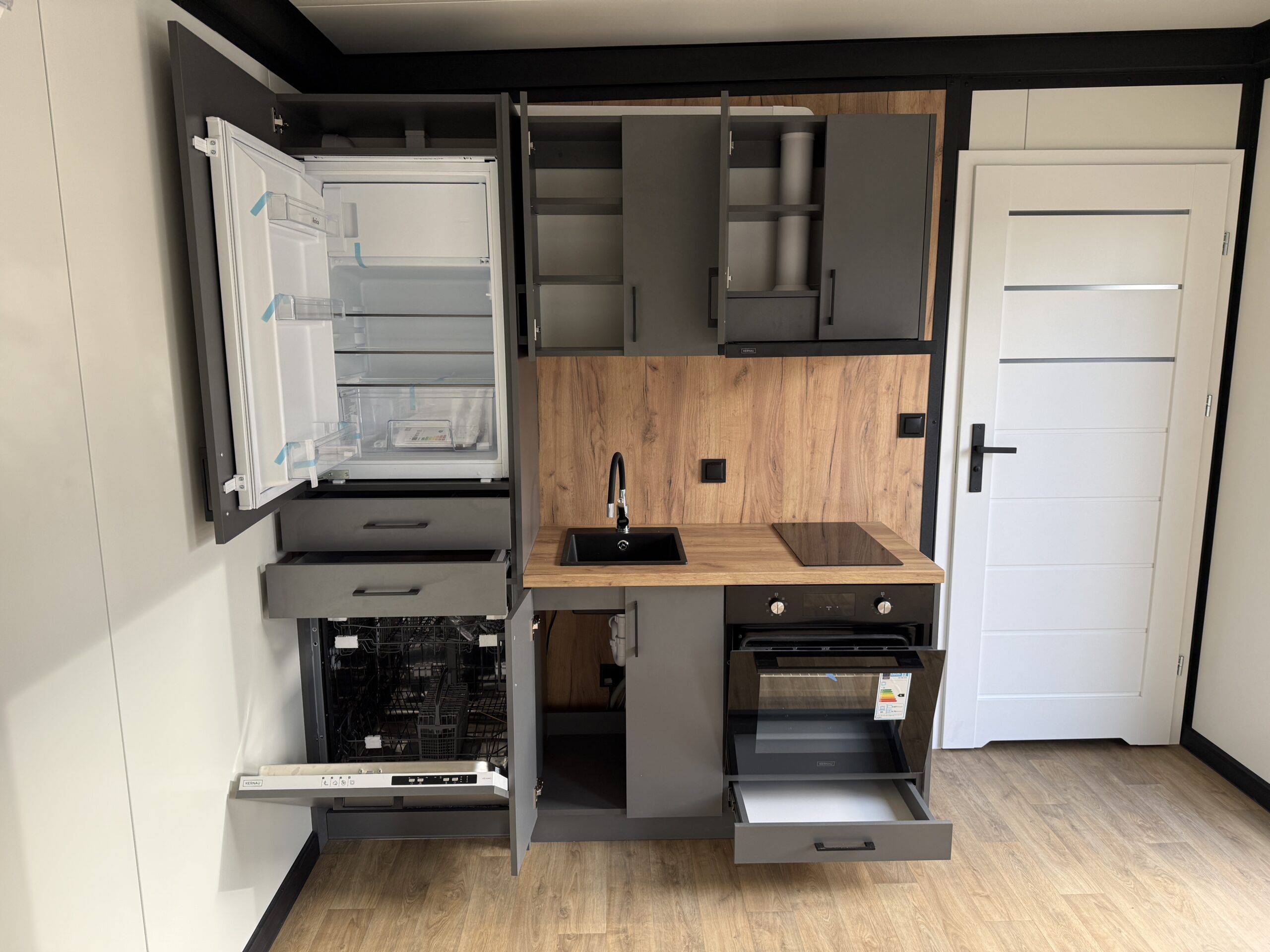 De keuken is van alle gemakken voorzien. Elke keuken wordt standaard in de antraciet met houtlook kleurstelling geleverd.In de keuken bevinden zich standaard een indictiekookplaat met 2 pitten. Een oven met als optie magnatronfunctie. Boven de kookplaat een in het zwart afgewerkte afzuigkap met de uitblaas naar buiten. Ingebouwde koelkast met optionele vriezer. Standaard is deze keuken zelfs voorzien van een vaatwasser en uiteraard een harstenen wasbak in het zwart uitgevoerd met zwarte flexkraan.