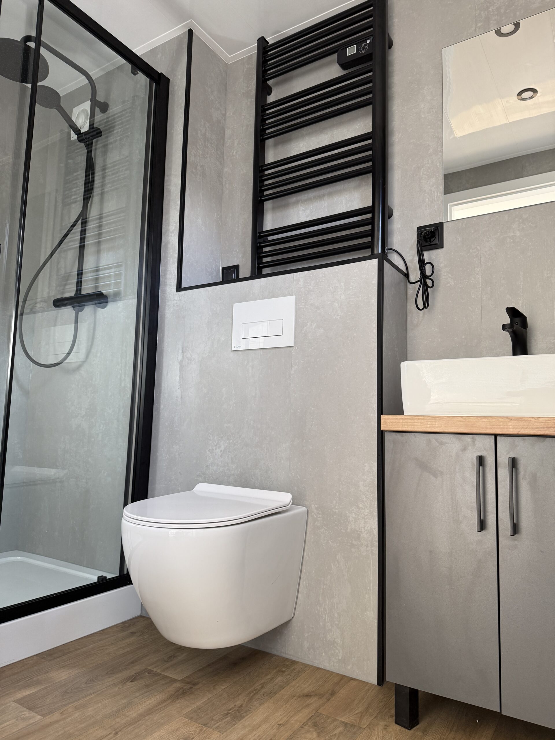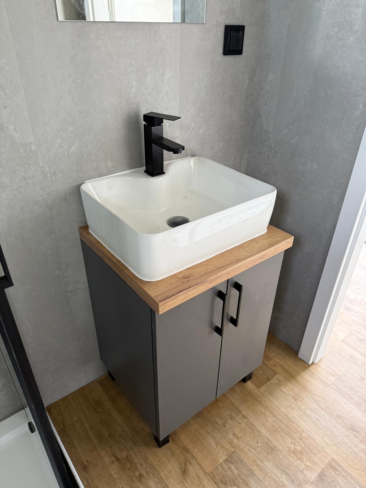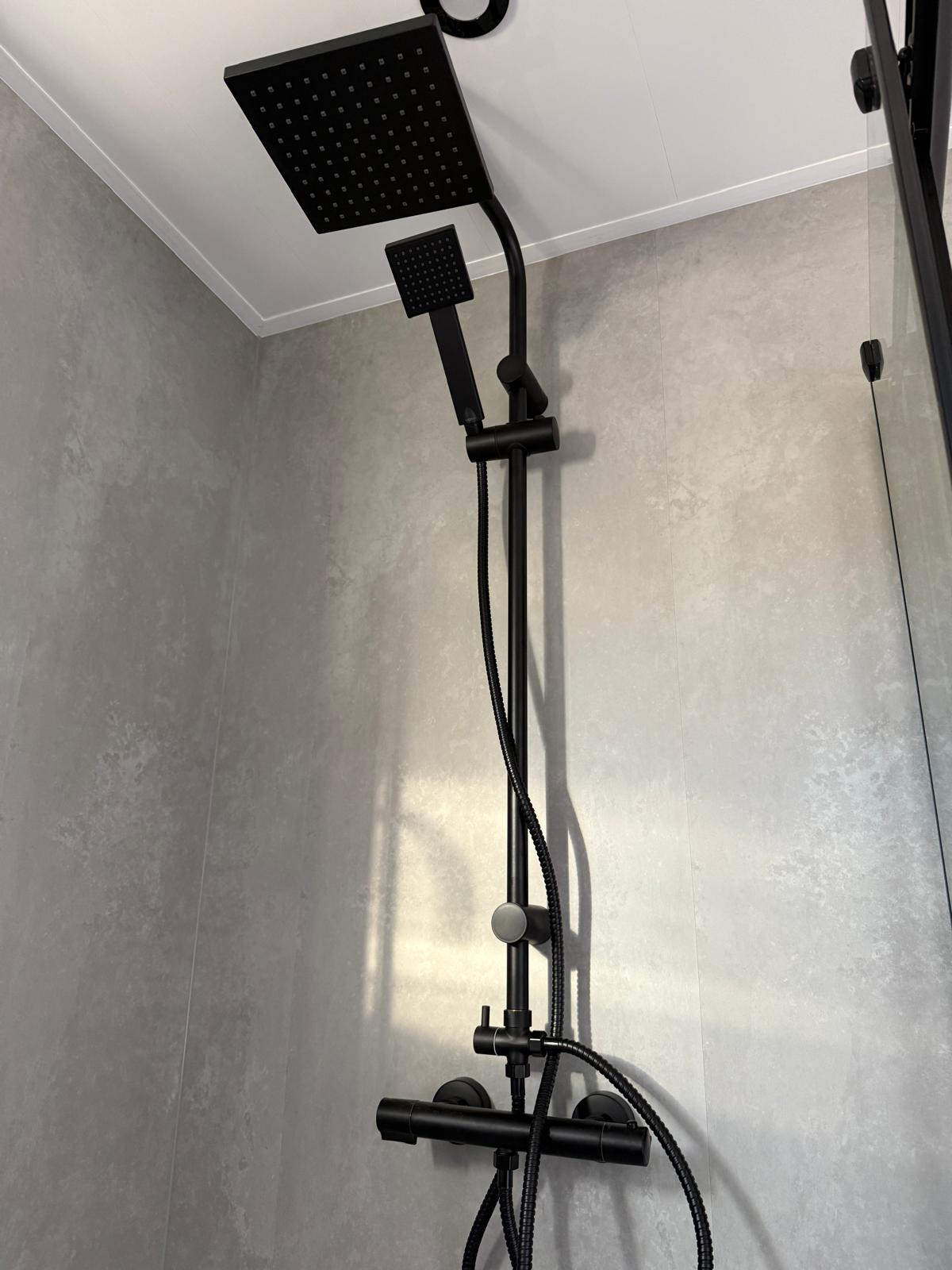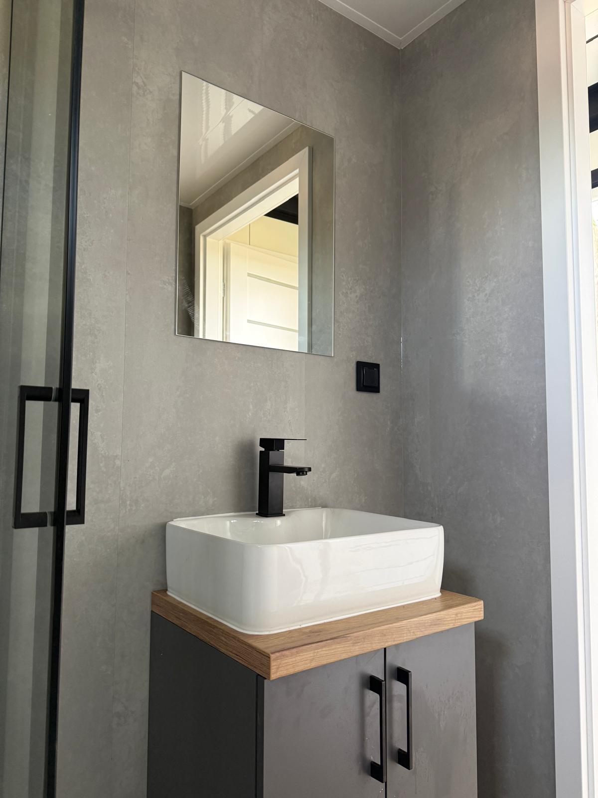 De badkamer is ingericht met een Cersanit Sat 50 wastafel in wit uitgevoerd in keramiek met Fabro chrome kraan. En tevens een spiegel (40 x 60cm) met witte achterplaat. En een Mexen Roma douchebak (120x80cm) in zwart uitgevoerd met Fabro chrome kraan met regendouche. De wandafwerking is standaard wit SPC. De vloer is afgewerkt met antislip SPC in de kleur antraciet.