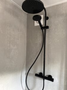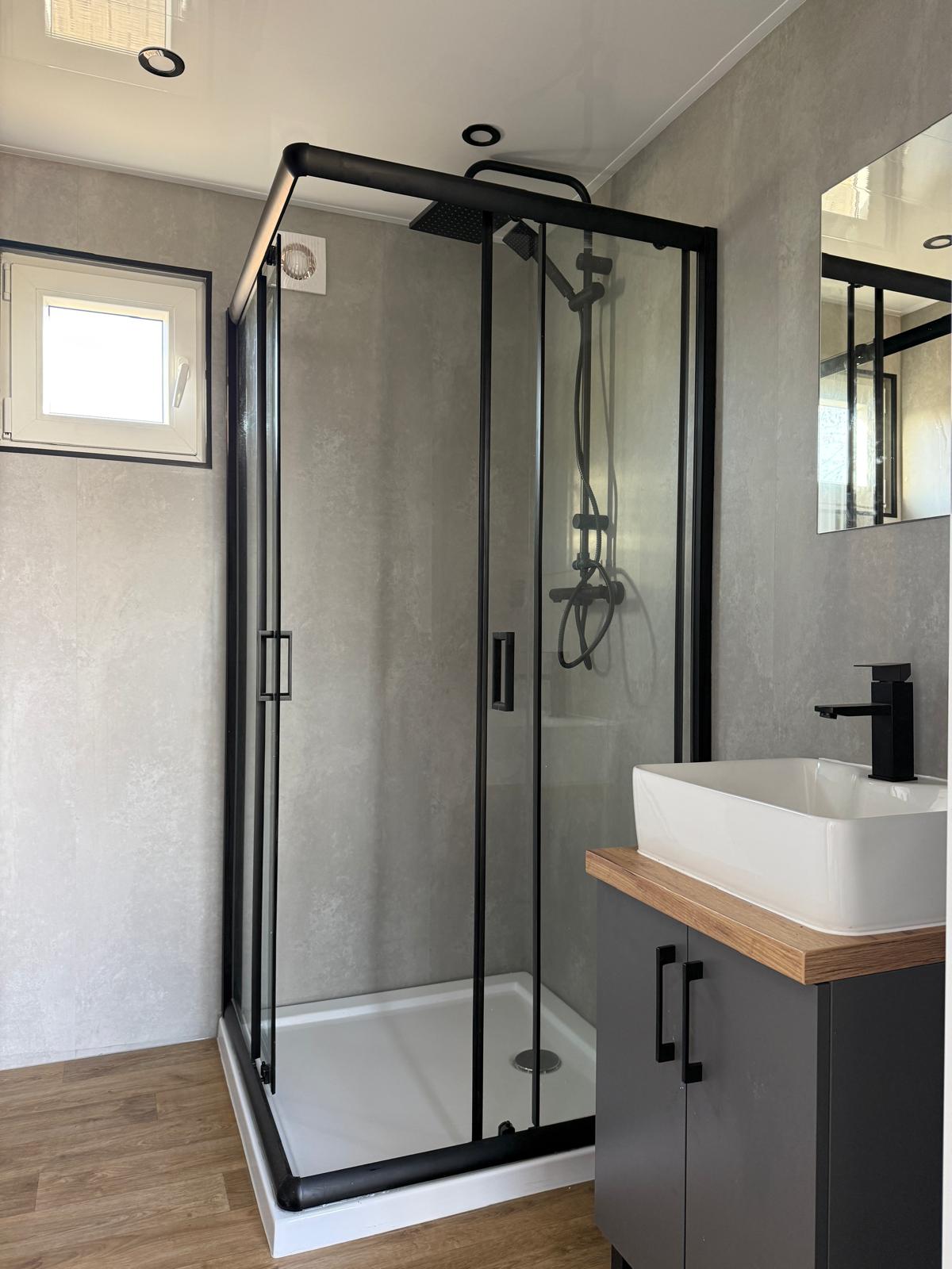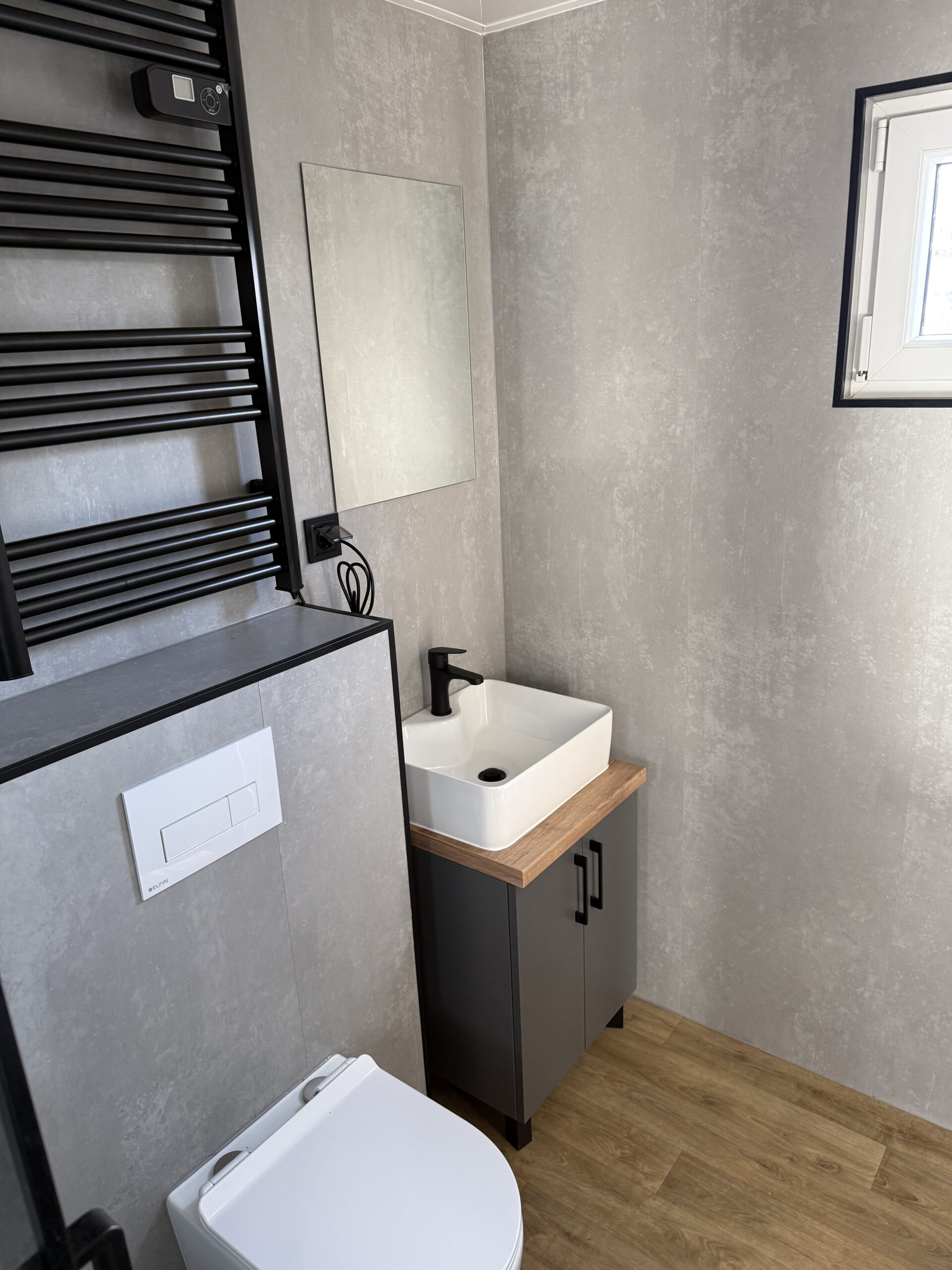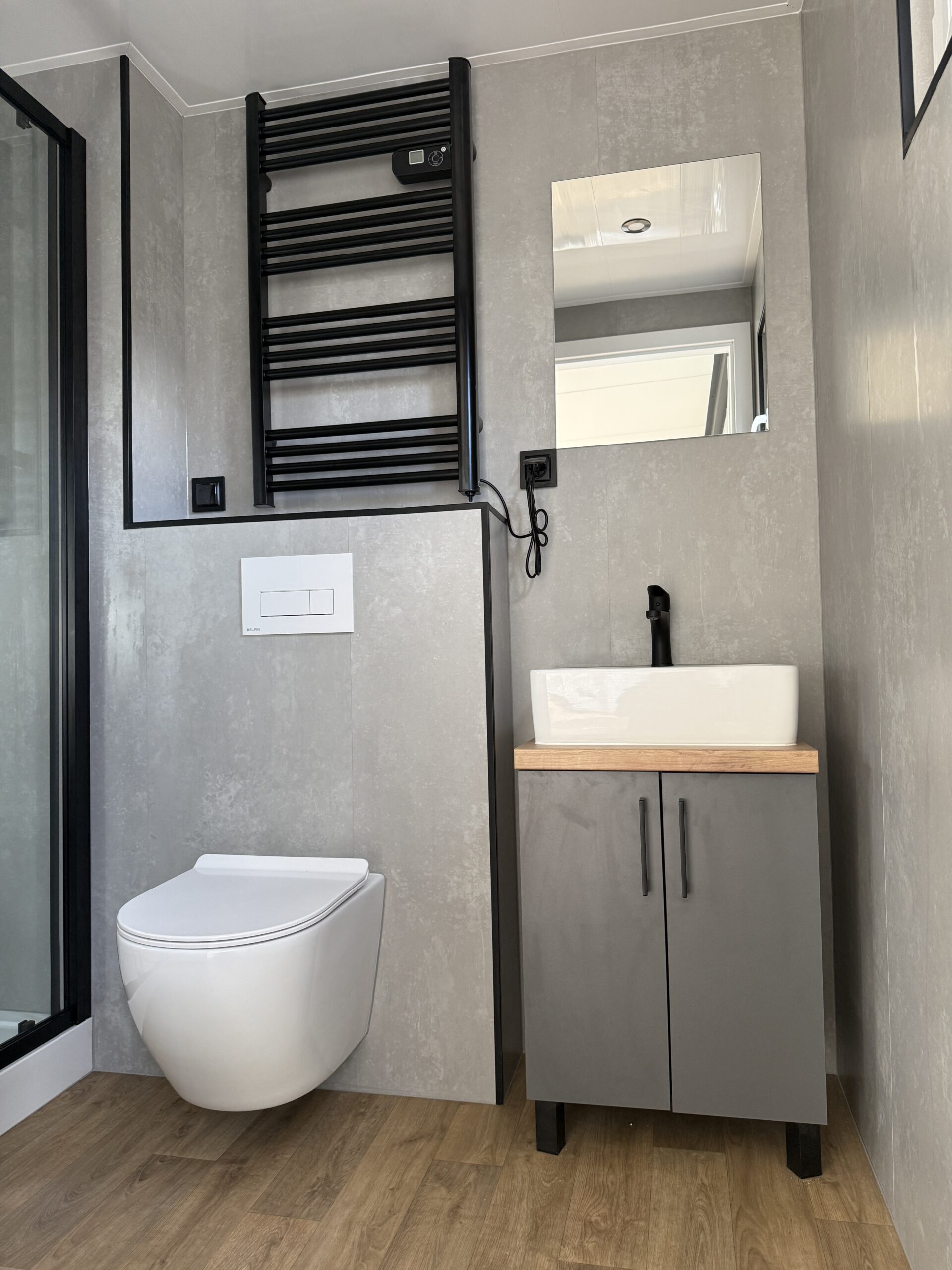 De badkamer is ingericht met een Cersanit Sat 50 wastafel in wit uitgevoerd in keramiek met Fabro chrome kraan. En tevens een spiegel (40 x 60cm) met witte achterplaat. En een Mexen Roma douchebak (120x80cm) in zwart uitgevoerd met Fabro chrome kraan met regendouche. De wandafwerking is standaard wit SPC. De vloer is afgewerkt met antislip SPC in de kleur antraciet.