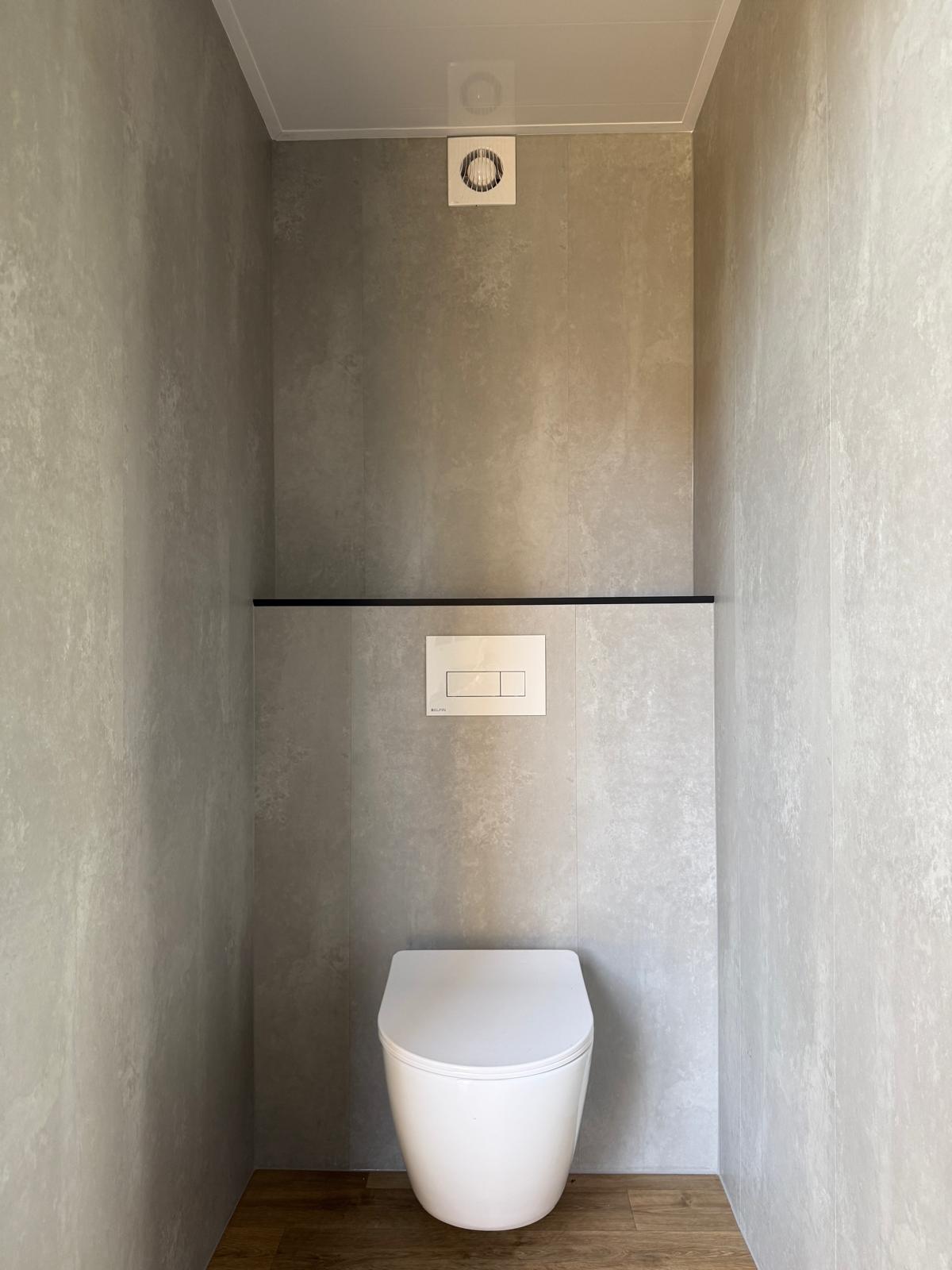 De toiletruimte is ingericht met een Wandcloset Schwab duplo wc 189 BAP in wit en inbouwreservoir met chrome bedieningspaneel Fabro ARS-0900-0. Voorzien van ventilatie en plaffonier.