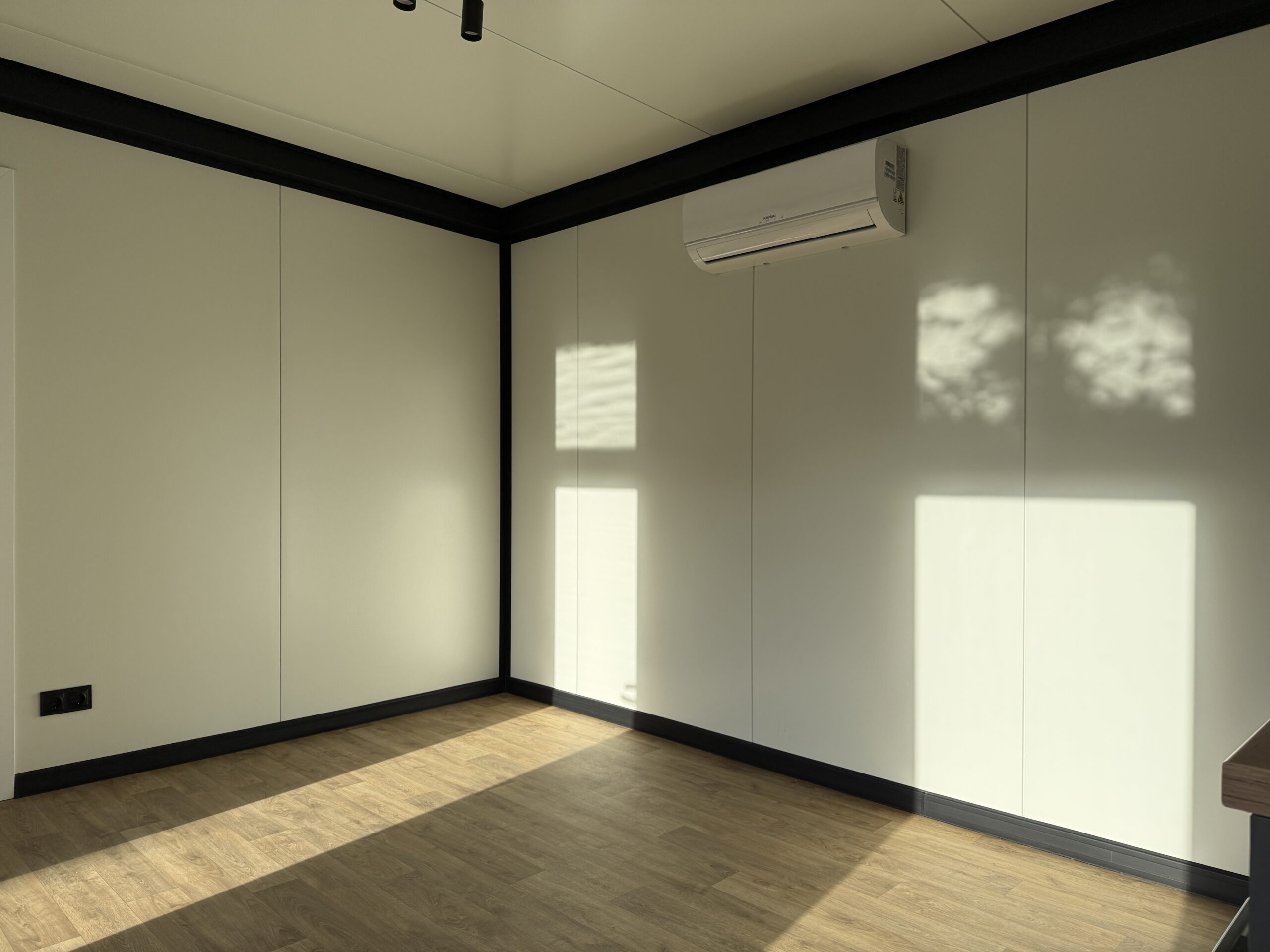 De niet dragende binnenwanden worden uitgevoerd als sandwichpanelen van het merk Europanels. De badkamer wordt aan de binnenzijde voorzien van spc. Het verlaagd plafond is afgewerkt met spc. De koven worden aan de binnenzijde afgedekt met zwarte tin in een basiskleur RAL9005 mat.
