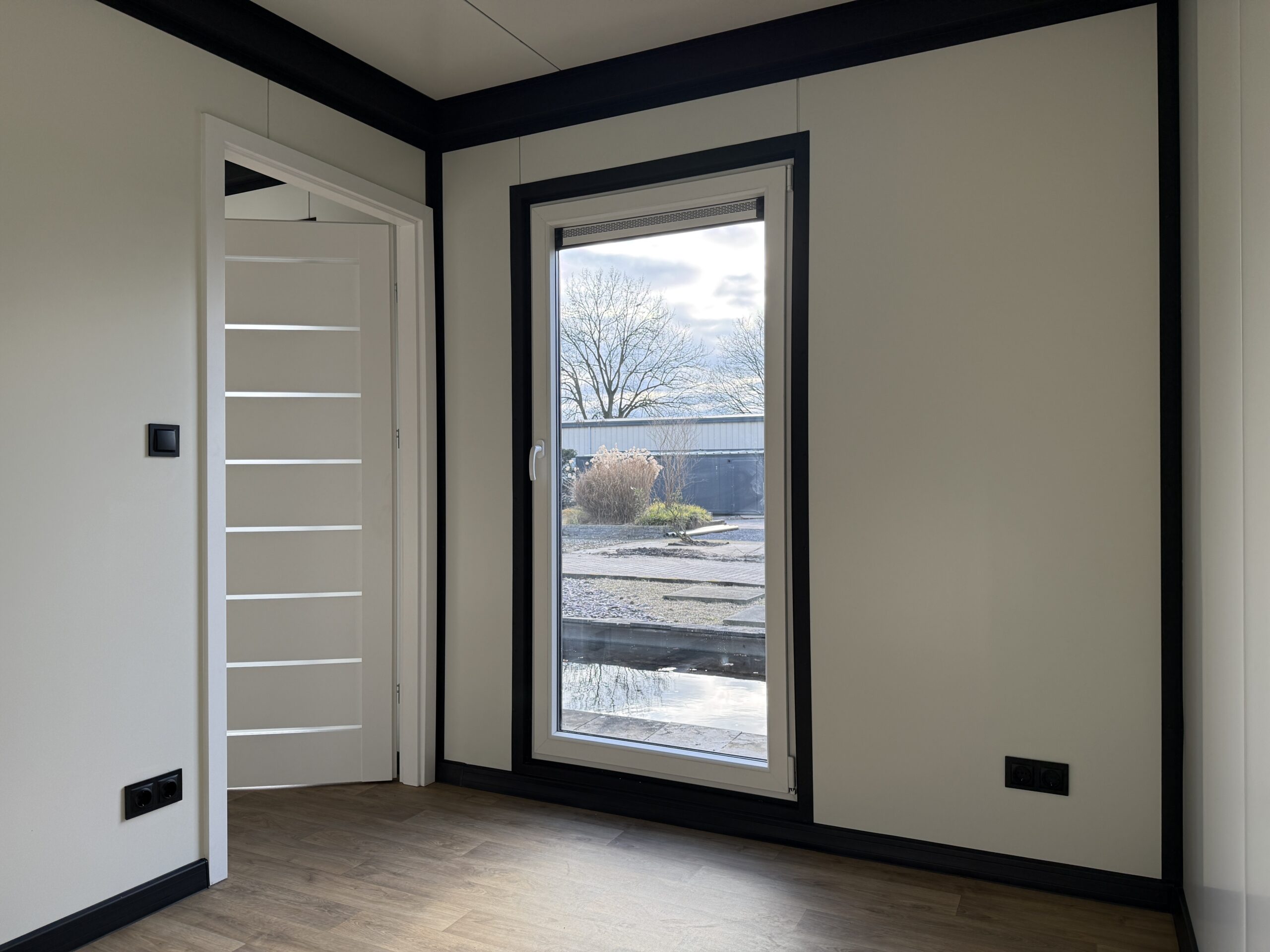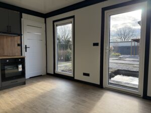 De voordeur wordt uitgevoerd als een kaderdeur met een glasvulling. Aan de achterzijde van de unit is een dichte paneeldeur voorzien t.b.v. het betreden van de technische ruimte.