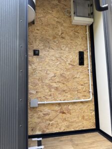 Elektraleidingen worden in een pvc mantelbuis in het sandwichpaneel en/of in de koof afwerking van de stalenportalen opgenomen.