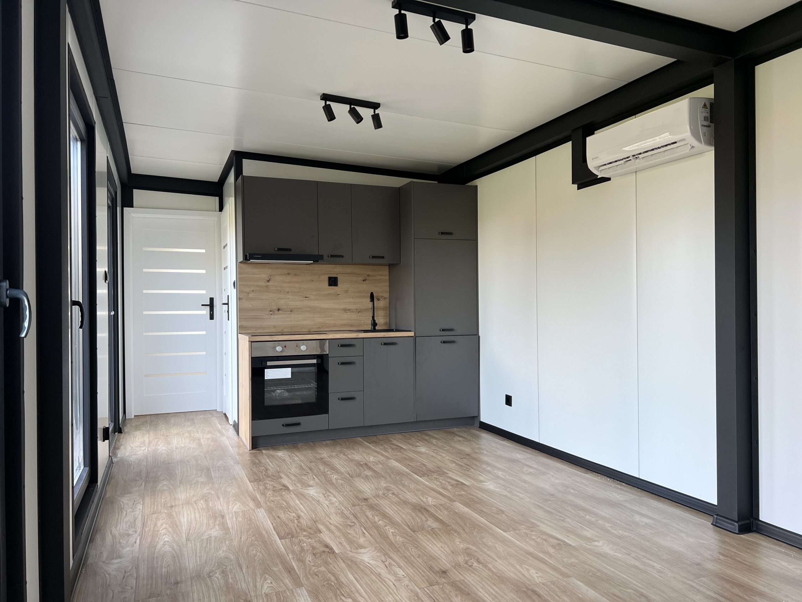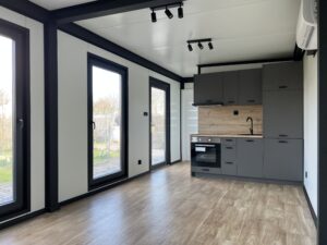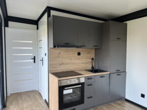 De keuken is van alle gemakken voorzien. In elke keuken wordt standaard in de antraciet met houtlook kleurstelling geleverd. In de keuken bevinden zich standaard een indictiekookplaat met 2 pitten. Een oven met als optie magnetron-functie. Boven de kookplaat een in het zwart afgewerkte afzuigkap met de uitblaas naar buiten. Ingebouwde koelkast met optionele vriezer. Standaard is deze keuken zelfs voorzien van een vaatwasser en uiteraard een harstenen wasbak in het zwart uitgevoerd met zwarte flex-kraan.