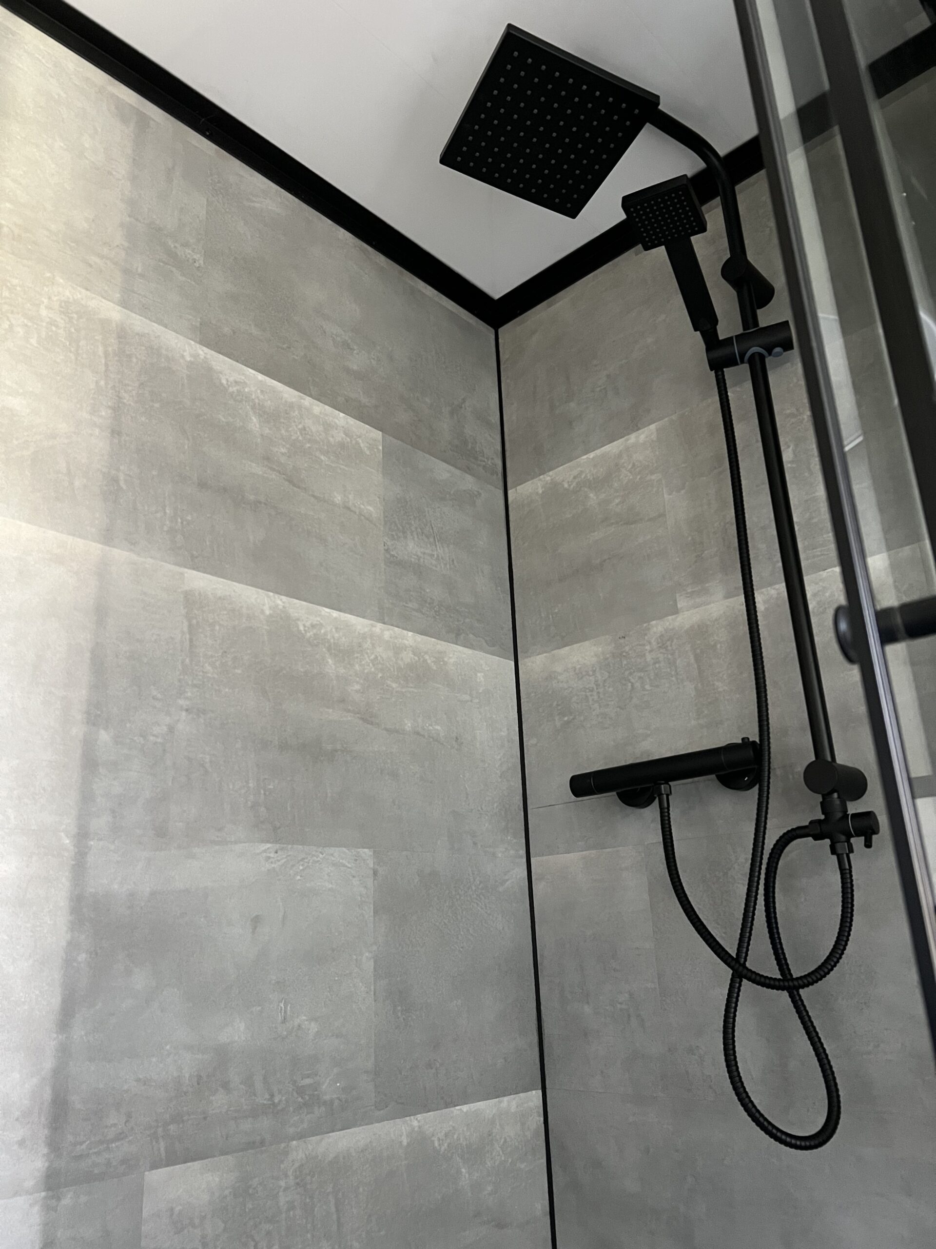 De badkamer is ingericht met een Cersanit Sat 50 wastafel in wit uitgevoerd in keramiek met Fabro chrome kraan. En tevens een spiegel (40 x 60cm) met witte achterplaat. En een drempelloze inloopdouche met afvoergoot en uitgevoerd met Fabro chrome kraan met regendouche. De wandafwerking is standaard wit SPC. De vloer is afgewerkt met antislip SPC in de kleur antraciet. Het toilet is standaard voorzien van de toiletbeugels. De boiler is geplaatst in de badkamer voor direct warm douchewater.