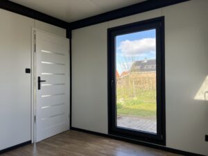 De voordeur wordt uitgevoerd als een kaderdeur met een glasvulling. Aan de achterzijde van de unit is een dichte paneeldeur voorzien t.b.v. het betreden van de technische ruimte.